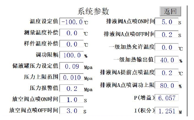 溫度設(shè)定值:設(shè)置低溫汽化器出口目標(biāo)溫度值;測量溫度補償:設(shè)置低溫汽化器出口溫度傳感器校正值:樣件溫度補償:設(shè)置樣件溫度傳感器校正值;調(diào)功限幅:設(shè)置低溫汽化器二級加熱大輸出功率;儲液罐壓力設(shè)定值:設(shè)置儲液罐內(nèi)目標(biāo)壓力值;壓力上限范圍值:設(shè)置儲液罐內(nèi)目標(biāo)壓力范圍值:壓力報警值:設(shè)置儲液罐內(nèi)目標(biāo)壓力上限報警值;放空閥點噴